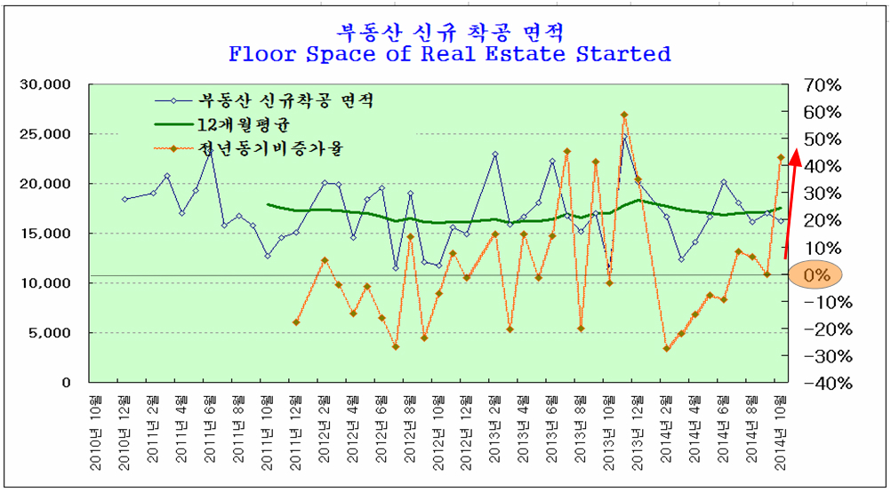 신규착공 면적을 월별로 나눠 전년 동기비 증가율을 구하면 9월 0%에 머물던 증가율이 10월 44%로 급증한 모습을 보여준다.