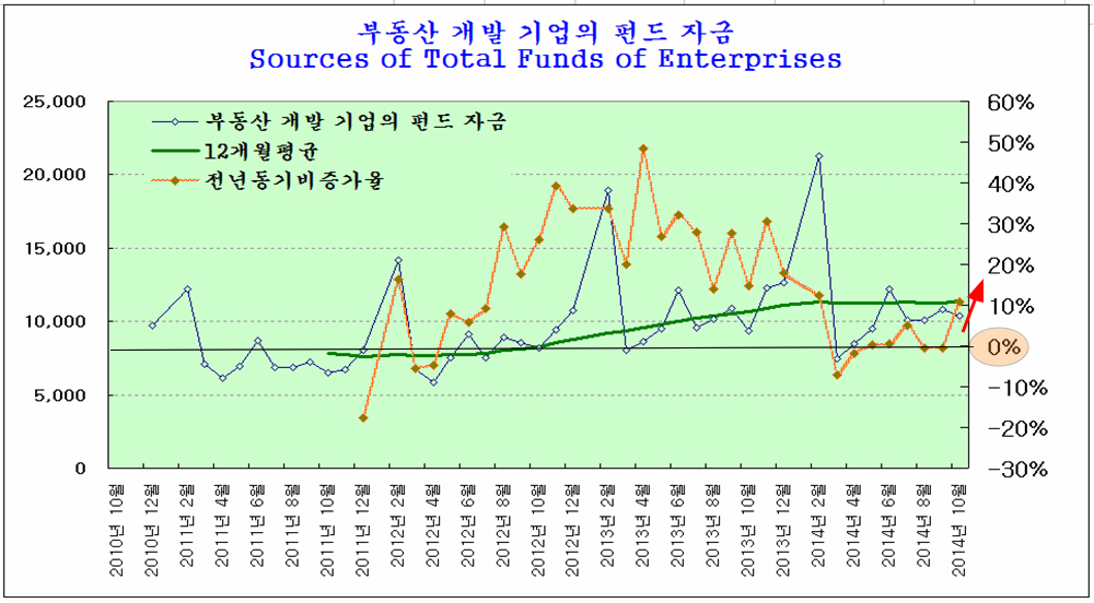 부동산 개발 회사들의 부동산 개발을 위한 자금 펀딩은 2013년 4월을 고점으로 감ㅅ고하였고, 올 3월 이후 증가율이 제로에 머물렀으나 10월 투자자금이 급중하며 10%의 증가율을 회복했다.