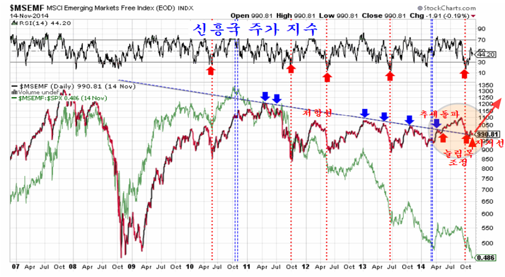 이미, 원유가격은 세계적인 경기 둔화와 중국발 고정자산 투자가 위축되며 강한 하락을 했던 2011년 하락폭 만큼 하락했다는 점에서, 특히 하락이 반등없이 이어지며 2008년보다도 RSI를 기준으로 더 과매도를 나타낸다는 점에서 비교적 강한 상승이 나타나기 쉽다.