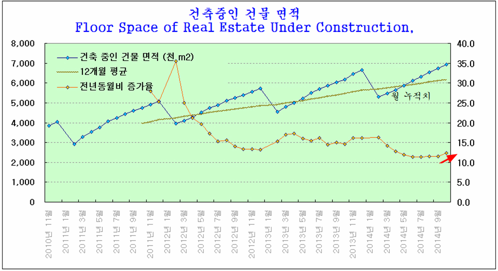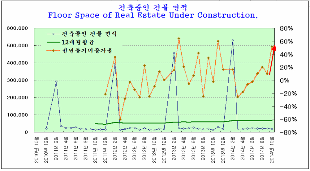 6월까지 전년 동기에 비해 마이너스 성장을 보이던 건축 중 건물 면적은 월별을 기준할 때 7월부터 증가로 돌아섰으나 9월 잠시 증가율이 둔화된 후 10월에는 55%대 급증의 모습을 보여준다.