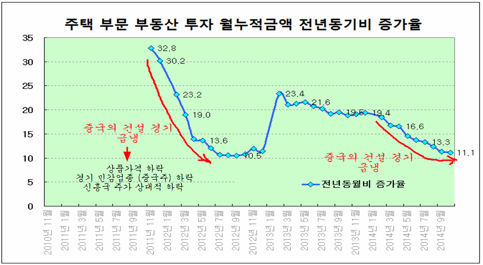 그 이유는 30% 넘는 높은 성장률이 유지되던 중국이 부동산 버블을 우려하여 2010년 하반 이후 부동산의 거래를 규제하고, 주택 구입을 위한 대출을 규제하며, 중앙정부 차원의 긴축 정책을 하면서 중국의 고정자산 투자 즉, 건설 경기가 급격히 위축되었기 때문이다.