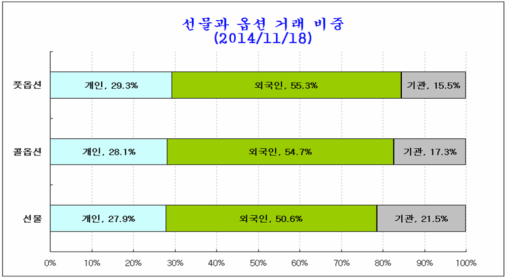 파생상품에서는 외국인의 거래 비중이 압도적으로 높다, 선물, 콜옵션, 풋옵션의 거래 비중은 외국인이 55~60%를 차지하는 듯 하다. 그만큼 돈벌기가 수월한 한국 시장에 세계의 꾼들이 몰려 있다 그런 점에서 자본투자 목적으로 현물을 거래하는 외국인도 있겠지만, 오직 선물과 옵션의 레버리지 높은 단기 차익을 노리는 외국인의 거래가 비중이 높다고 할 수 있다.