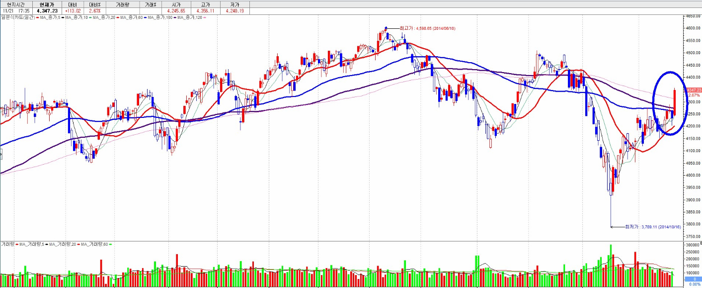 이미 유럽에서는 10월22일에 ECB에서 지난 9월에 발표한 자산매입프로그램에 따라 이탈리아 커버드본드를 매입하기 시작하면서, 추가적인 경기부양책으로 회사채 매입 여부를 12월까지 결정해 내년 초에 시작할 수 있다는 전망을 내놓으면서 상승했고, 11월7일에는 저 인플레이션에 대해 비전통적인 정책을 내놓는데 정책위원들이 만장일치로 찬성을 하며 급등했다.