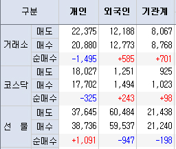 위의 차트에서 보는 바와 같이 지수는 미국경제지표 호조세가 지속된 가운데 외국인과 기관이 동시매수가 유입되면서 장초반 부터 강한 흐름을 나타내며 5일 이평선의 지지선을 지켜내며 결국 상승흐름을 보여주었다.