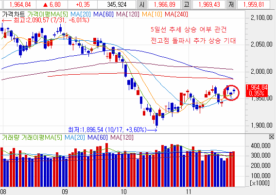 기술적 흐름상 현재는 5일선에서 지지받으며 상승하고 있는 상황이기 때문에 5일선의 지지 여부가 계속 중요할 것이며 무엇보다 투자심리 개선이 더더욱 절실해 보인다.
