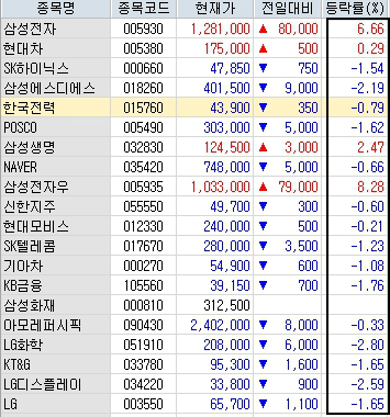 시가총액 상위종목들의 시세---삼성그룹주만 상승.