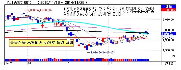 외국인의 누적선물순매도 포지션을 풀 생각을 안한다. 왜냐면 12월11일 쿼더러블 만기일이면 청산되어서 자동으로 수익이 떨어지는데 누가 풀겠는가? 누가 금융시장에서 중산층을 지키고 누가 선량한 투자자를 지켜내야 하는가? 금융위 아닌가? 필자는 금융위의 제1번 사명은 투자자보호와 금융시장의 수문장역할 이라고 생각하는데 여러분은 어떠신지?