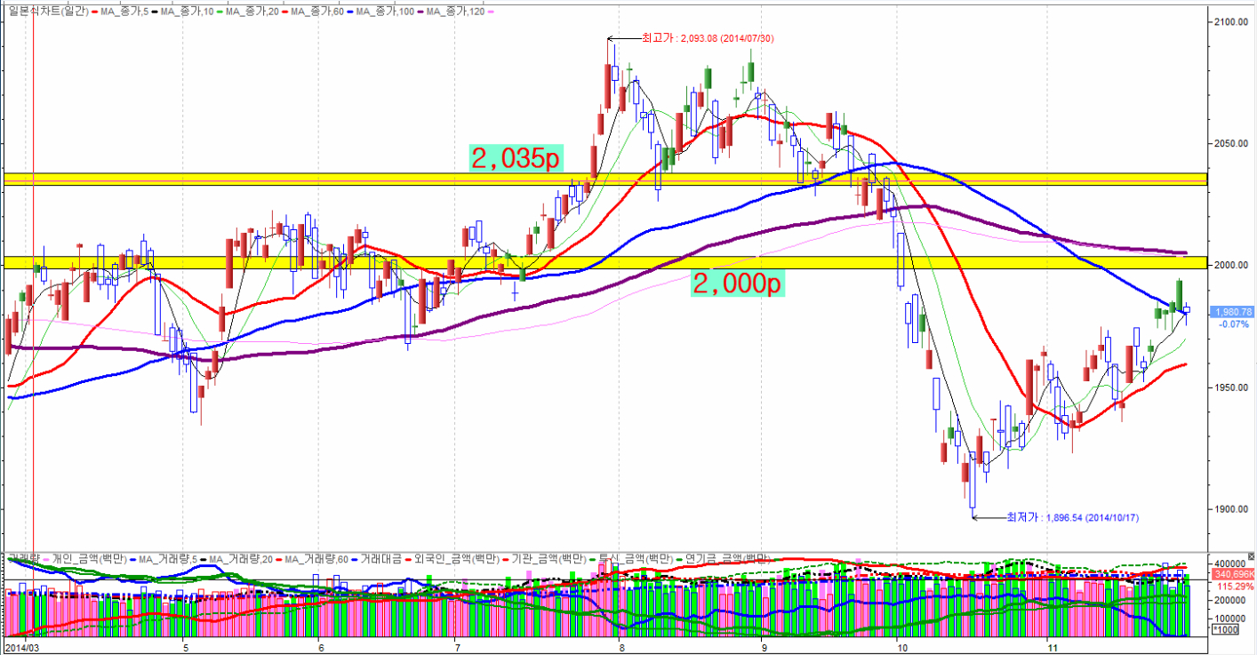 2,000p를 돌파하려면 날을 세우고 있는 60일 이평선이 하락각을 완만하게 돌려 우상향으로 방향을 틀어야 한다.