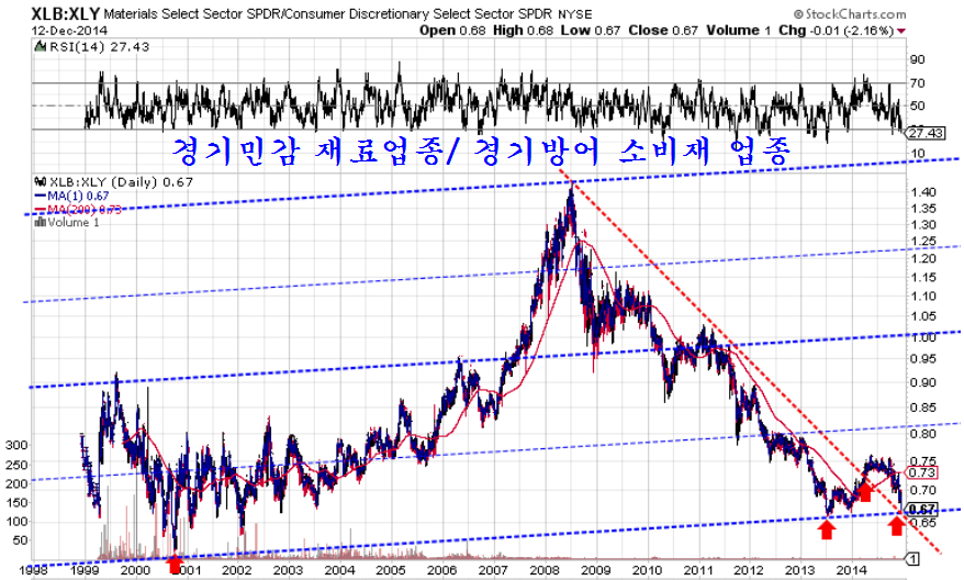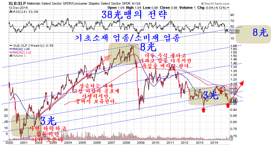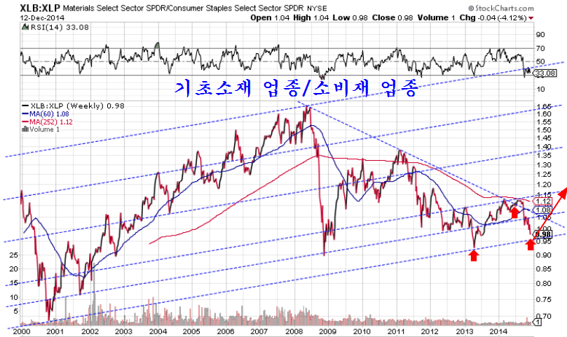 따라서 이후의 경기 민감주의 상승은 2002 ~ 2008년과 같은 장기 상승국면이 전개될 가능성이 매우 높다. 2013년 상반의 저점을 기점으로 상승 추세를 시도했던 경기민감주는 2014년 하반 일반의 상승 기대를 꺾어 포기를 유도하는 하락 과정으로 눌림목을 형성한 후 본격적인 상승으로 갈 모습이다.