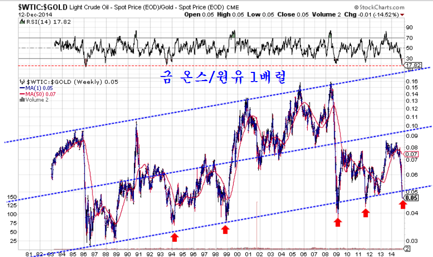 금을 기준한 원유가격은 역사적인 수준으로 하락해 있다. 과거 1994년, 1998년, 2009년, 2012년 금을 기준한 원유가격이 채널 하단에 진입하였고 이 시기는 모두 주식시장의 장기 또는 대세 저점이 형성되는 국면이다.