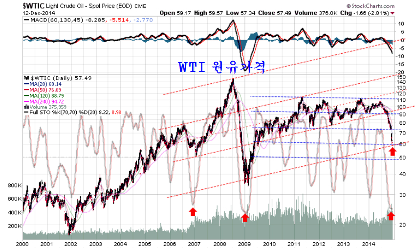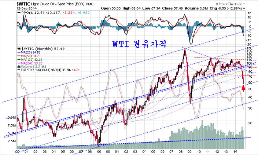 10월 이후 이상 급락을 해 온 원유가격은 금요일에도 거래가격을 낮추어 텍사스 중질유 기준 57$ 수준에 있다. 그러나 이런 원유가격 변동도 선물만기가 가깝기 때문에 가능한 것으로 만기와 함께 10월~12월 급락했던 하락분 (90$ ~ 57$)은 대개 다음 선물 만기까지 회복되는 급반등 국면이 되기 쉽다.