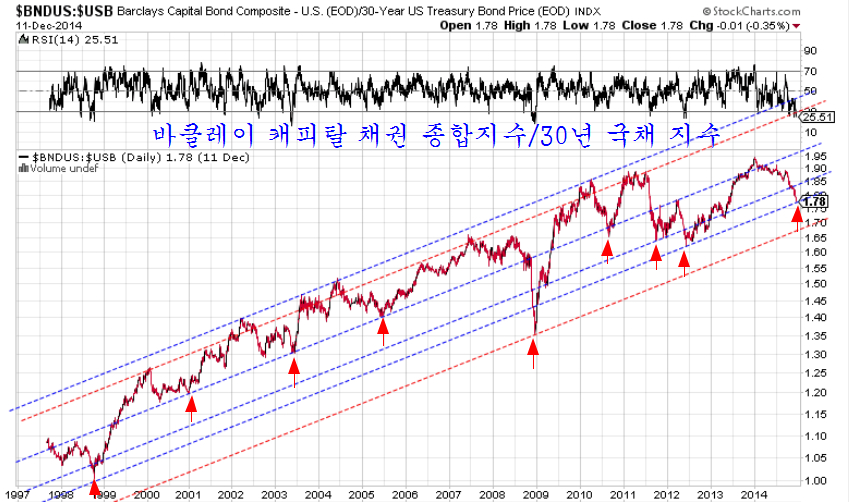위에 보이는 그림은 바클레이의 캐피탈 본드 채권 종합지수를 미국의 30년 국채가격으로 나눈 상대비율이다. 일반채권 종합지수를 30년 국채로 나눈 것인데 이 국채의 저점이 형성되는 곳은 예외없이 주식 시장의 중장기 저점이다. ( 이 시기가 주식시장에서 어떤 의미가 있는 곳이었는지 반드시 주가지수를 비교하여 그 의미를 확인해 두라)
