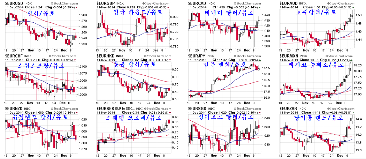 다음은 유로에 대한 여러 나라의 환율이다. 유로는 이미 산유국 통화에 대해 강세가 이어지고 있지만, 달러나 달러에 고정환율인 홍콩 달러에 비해 약세를 보여왔으나 최근달러에 대해 유로가 강세로 움직이고 있다. 또한 달러 이외의 통화에 대해서도 전반적으로 상승세로 전환되고 있다. 이것은 1년여에 걸쳐 이어져 온 유로와 약세 국면이 마무리 되고 유로와 자체의 통화 가치 상승과 함께 유로화 환율이 오르게 되는 것을 의미한다.