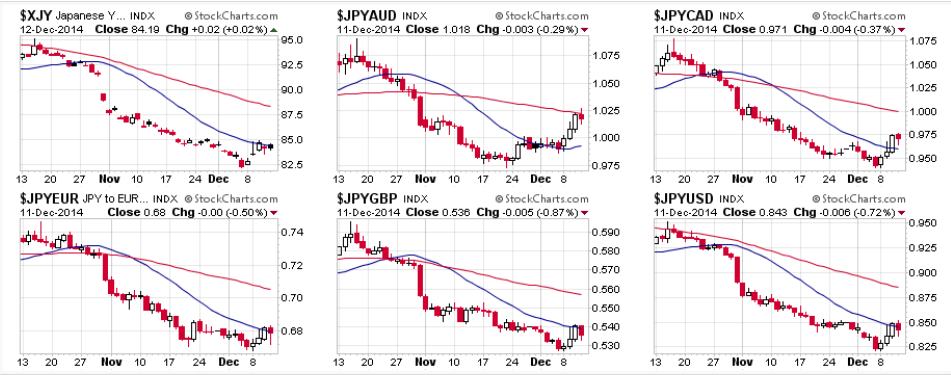 하락이 이어졌던 엔화 역시 상승으로 반전되어 있다. 다음은 엔화에 대한 각 통화(호주달러, 캐나다 달러, 유로, 영국 파운드, 미국 달러)의 환율로 하락하던 엔화가치가 각 통화에 대해 일제히 상승하고 있다. 달러에 대한 상승이 아니라 과도한 하락을 한 엔화 자체의 가치 상승이 전개되는 것이라 할 수 있다.