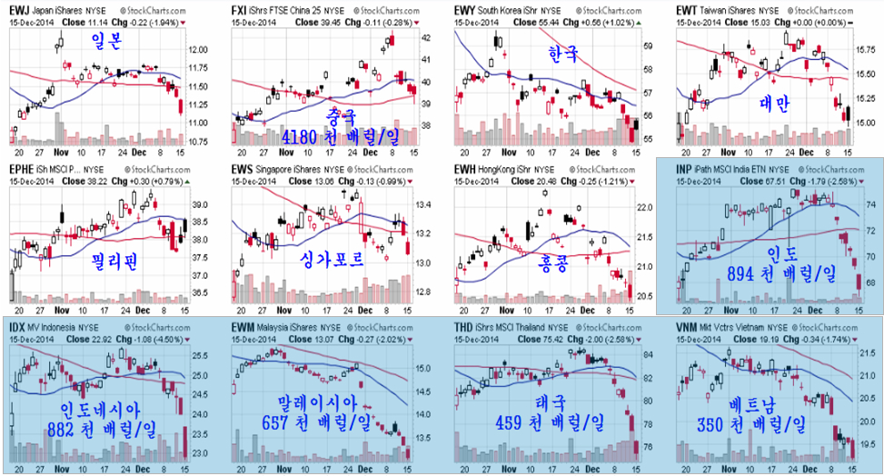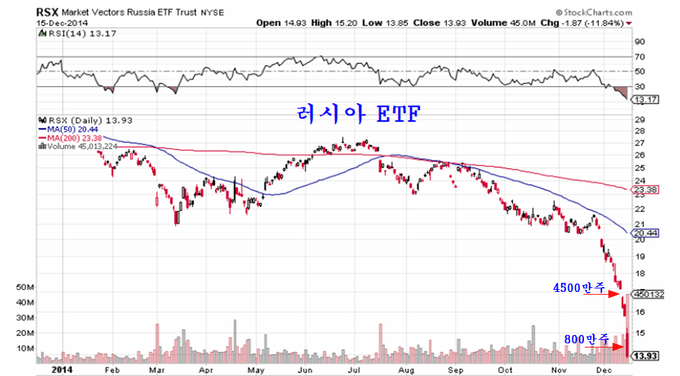 여하튼 환율이 오랜 급등 끝에 6% 넘은 불꽃 상승을 한 15일, 뉴욕시장에서 거래되는 러시아 펀드 ETF 는 환율 변동과 주가 변동을 포함 11%가 넘는 하락을 하였다. 이와 함께 평소 800만주가 거래되던 이 펀드는 다섯배인 4500만주가 거래되므로써 강력한 매수세가 진입하는 것을 보면 러시아를 모멘텀으로 하는 약세 국면도 전환점을 맞은 듯 하다.