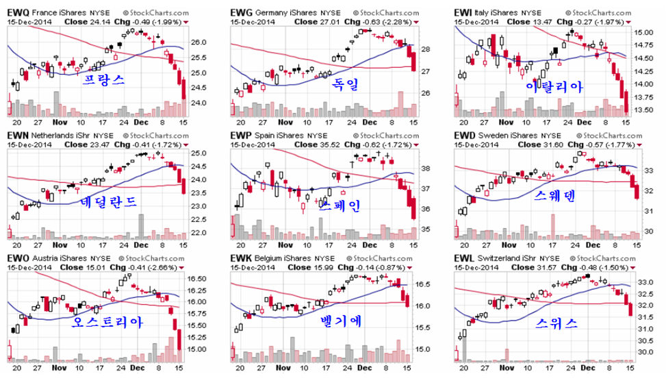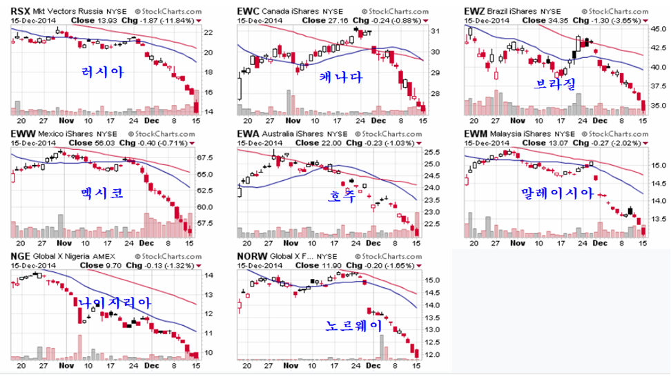유가 하락으로 산유국의 주가가 일제히 급락했다. 특히 러시아 주가가 강한 하락을 하였고 멕시코 같은 경우는 15일 연속 음봉 하락이 나타나는 증시 사상 매우 드문 하락세가 이어지기도 했다.