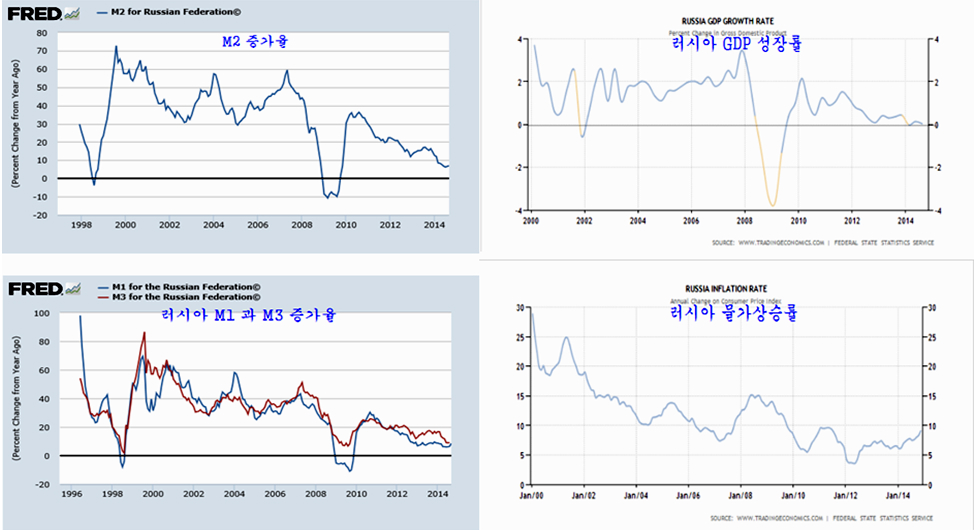통화 변화 추이와 GDP, 그리고 물가지수 움직임을 보면, 2008년 이후 유가 급락으로 환율과 물가가 상승하면서 한때 물가지수가 15%에 이르렀으나 그 이후 지속적인 통화 긴축으로 GDP 성장이 둔화된 대신 물가상승률을 5% 수준으로 낮추었다. 그간 장기간의 긴축으로 물가를 안정시키고 있어 물가상승이나 통화가치 하락이 화폐 남발과는 무관하다. 적어도 러시아 중앙은행은 경기변수를 장악하고 있다고 해야 할 것이다.