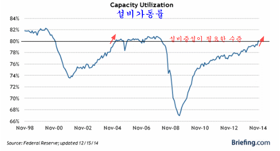 이런 소비자의 심리 호전, 유가 하락과 함께 미국의 산업생산이 중요한 대세 상승의 펀더멘털 조건을 만족시키고 있다. 미국의 산업생산이 견실한 상승세를 나타내면서 설비가동률이 2007년 80%를 하회한지 7년 만에 다시 80%를 회복하고 있다. 설비가동률 80%는 사실상 설비 풀가동 상태로 추가 생산을 위해서는 설비의 투자가 필요한 수준이다. 따라서 설비투자 확대에 따른 경기 성장을 특징으로 하는 쥬글라 사이클의 성장 국면이 시작된다.