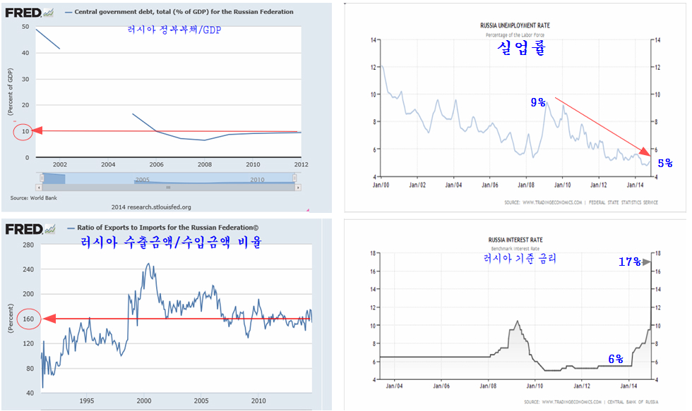 러시아 정부의 부채는 2008년 금융위기 후 낮아져 10%대의 세계 경제 상위국 중 가장 낮은 모습을 보이고 있고, 유가 하락 전 수입금액 대비 수축금액은 160% 수준으로 꾸준한 무역 흑자가 누적되어 왔다. 2010년 실업률도 그간 꾸준히 낮아져 2014년 5%대의 활황기 구준의 실업률을 보여 한 분기 동안의 유가의 하락 변동을 빼면 펀더멘털에 큰 문제가 없어 보인다.
