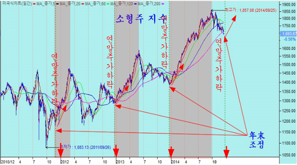 대형주 지수는 파생상품과 관련한 변동 때문에 이런 모습이 잘 드러나 보이지 않지만, 소형주 지수는 보다 분명한 연말 결산 효과가 나타난다. 2011년, 2012년, 2013년, 2014년 모두 연말이 되면 지수가 하락을 했다가, 연말 근처부터 상승을 시작하여 적어도 상반기 중에는 대단히 강한 상승 장세가 전개된다.
