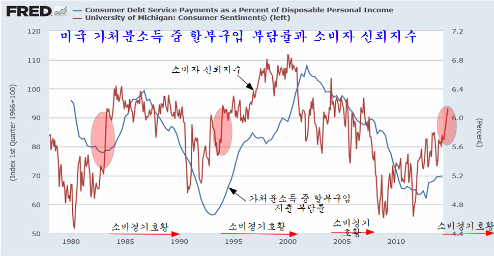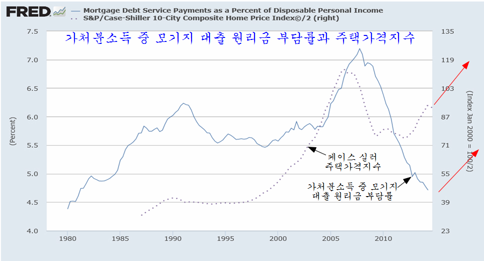 한편, 미국의 가계는 할부구입대출 뿐 아니라 주택구입을 위한 모기지 대출의 가처분소득 대비 원리금 부담률도 지난 30년래 최저로 낮아져 있다. 이것은 그만큼 소비와 주택을 구입할 여력이 확대되어 있음을 나타낸다.