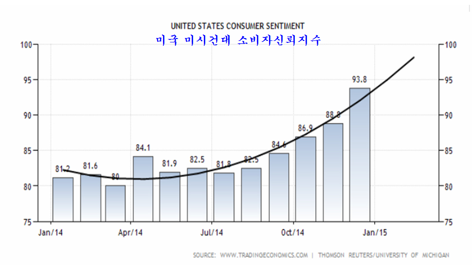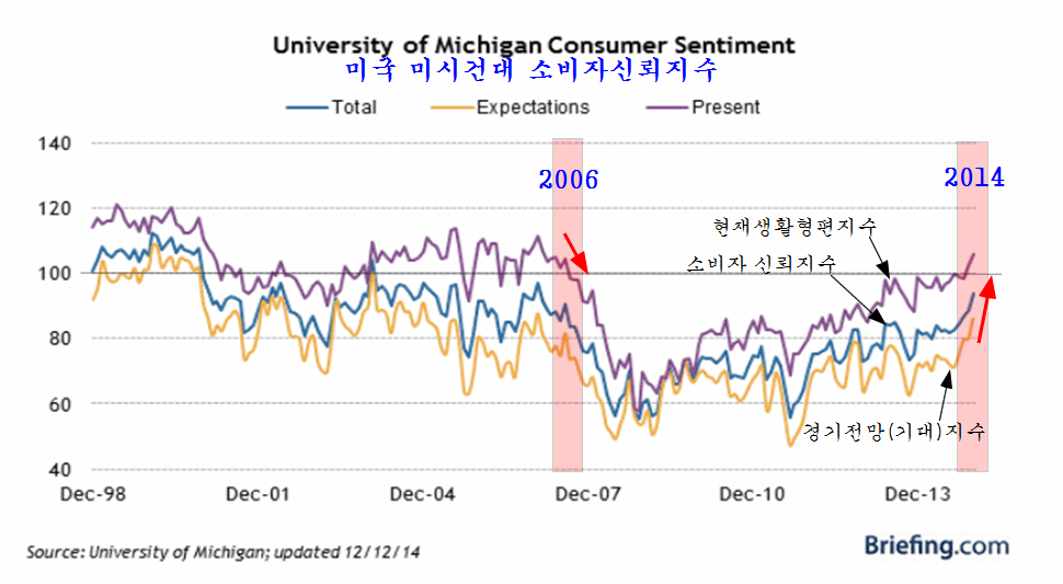특히 소비자 신뢰지수가 90을 넘어선 것은 소비와 부동산이 절정인 2006년 이후 8년만의 일이며, 현재상활 형편지수가 100을 돌파한 것도 이와 같다. 한편, 미국의 소비자 신뢰지수가 가파르게 상승하는 기울기는 그래프가 표시된 1998년 이후 가장 강력한 증가세이다.