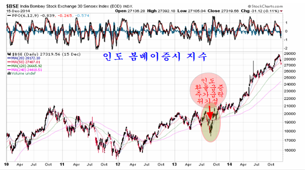 아마 기억력이 좋은 투자자라면 2013년 7월 인도의 위기설을 기억할 것이다. 당시 인도의 주가가 급락하며 환율이 급등했는데 이 때 인도를 비롯한