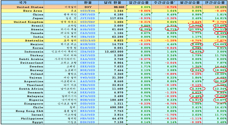 뿐만 아니라 산유국이 자유 변동환율인 경우 유가 하락과 함께 환율 변화도 크게 나타났다. 올 들어 주요 산유국 환율은 브라질 13.68%, 캐나다 8.49%, 멕시코 14.66%, 노르웨이 18.4%가 올랐고, 러시아는 76.11%가 올라 산유국 중에서도 러시아의 환율 상승이 특히 가파르다. 우크라이나 및 크림반도의 정치적 갈등과 함께 러시아 루블화는 강한 환율 공격을 받고 있다고 하겠다.