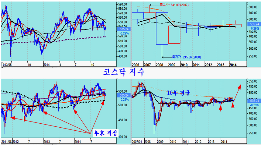 코스닥 지수는 소형주 지수보다 변동이 급격하고 크게 나타나지만 기본적으로는 소형주 흐름과 같다. 특히, 월봉 장기 추세를 보면 지난해 2013년 5월에 이어 지난해 5월과 7월 10년 평균의 저항으로 되밀려 있는데 이제 연초 수급 호전과 함께 상승이 시작된다면 10년 평균을 넘어 강한 추세를 형성할 가능성이 있다. 네번째 돌파 시도로 저항이 돌파되면 기술적으로 비교적 강한 추세가 뒤따르기 쉽다.