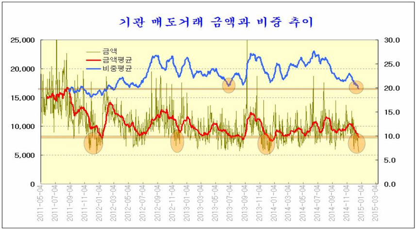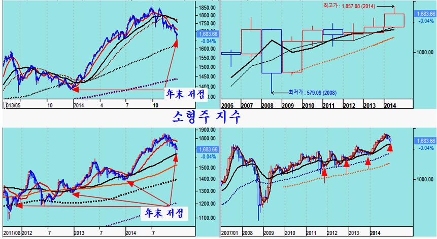 이처럼 기관의 매도가 줄어들게 되면 중대형주 매물 압밥이 크게 감소하여 중장기 바닥을 형성하기 쉽다. 특히 새해 들어 결산을 마친 국내외 펀드들이 2015년 이후를 겨냥한 새롱운 포트폴리오로 주식을 사게 되므로 수급 호전에 따른 긍정적 국면이 이어지기 쉽다.
