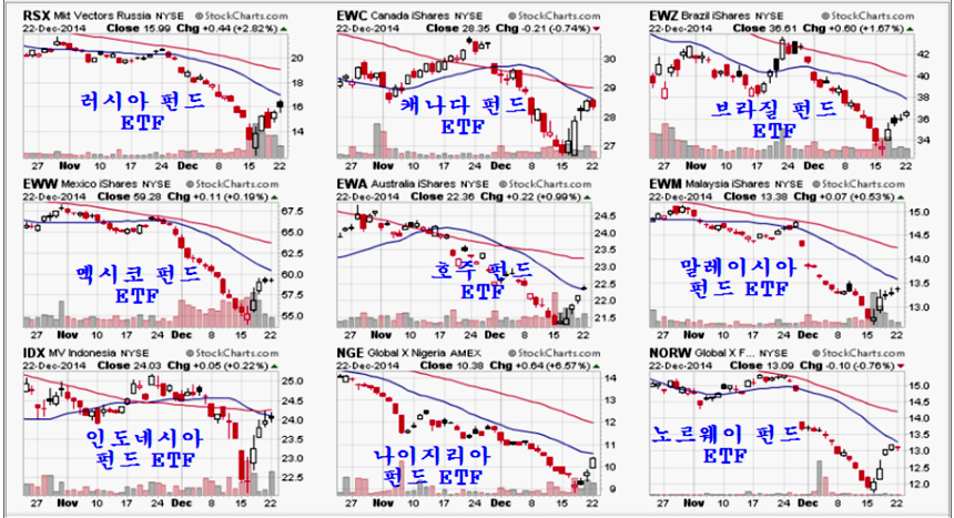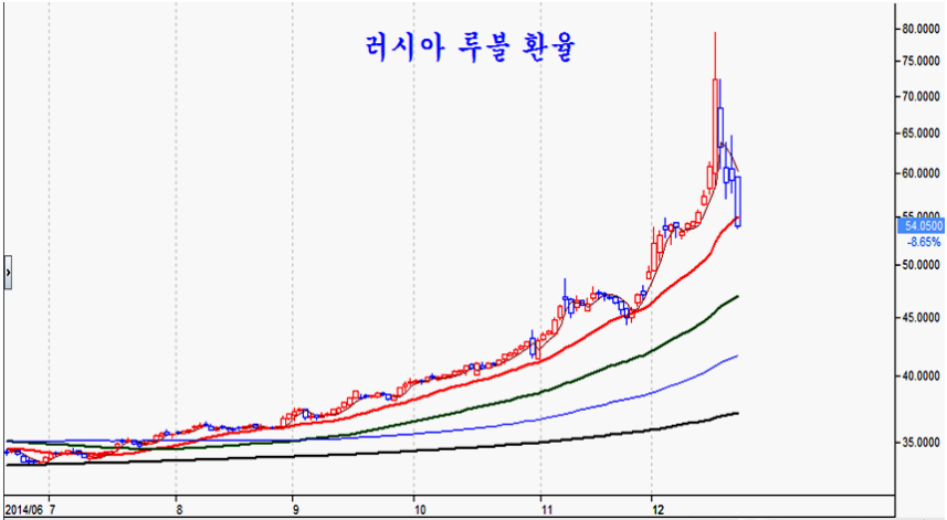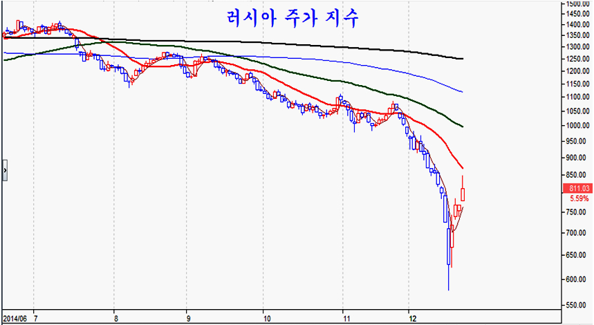외환선물 만기 무렵 달러당 79루블까지 치솟으며 러시아 위기설의 원인이 되었던 루블화 환율은 만기 후 4일 연속 하락이 이어지며 달러당 54루블로 하락 안정되었고, 600을 이탈했던 러시아 주가지수도 800을 넘어서며 20일 평균에 접근하여 쉴 자리를 찾고 있다.