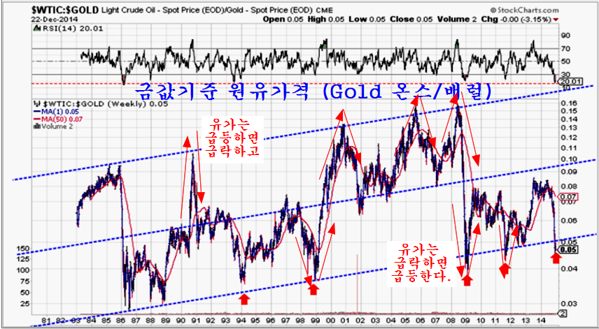 파생상품 만기와 함께 급락이 진정되고 박스권으로 바닥을 다지는 원유가격은, 금으로 환산한 유가를 보면 역사적인 관점에서 저평가 상태에 있어 큰 하락이 이어지기 어려울 뿐 아니라 급락에 따른 급반등이 쉬운 모습이다.