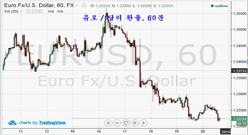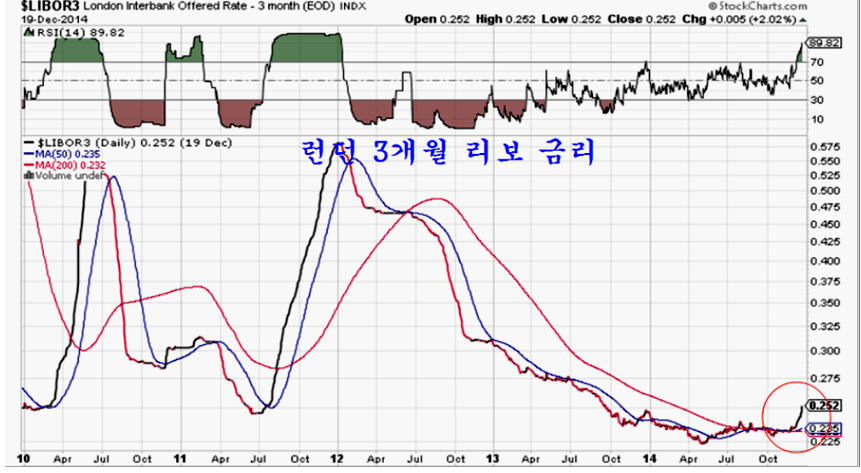 반면, 런던의 은행간 대출금리인 리보금리 3개월 물의 금리가 오르고 있어, 유럽에 대한 리스크 요인이 유로화를 약세로 이끈 것 같다. 주초 러시아 환율과 주가가 변동을 하면서 불거진 러시아 위기론과 함께 유럽에 대한 리스크가 커졌기 때문인 것 같다.