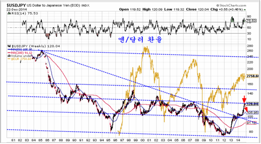 마찬가지로 달러에 대한 엔화의 환율 역시 대세 가격 구조상 중요한 저항권이며 120엔/달러에서는 엔화가 상승하여 환율이 반락하기 쉽다. 따라서 추후 달러가 하락으로 전환되면서 환율이 하락하고, 미국 자본의 해외 자산 투자 확대가 이어지는 과정에서 세계 증시 상승이 기대되는 국면이다.