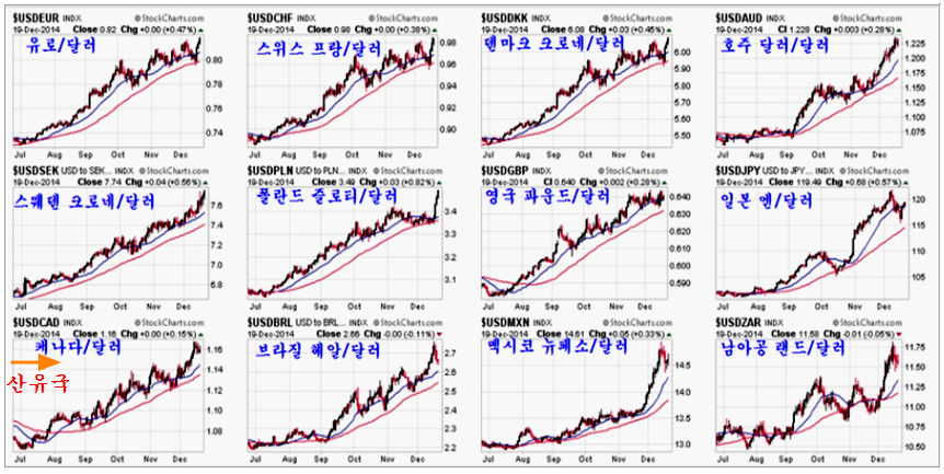 그러나 이런 달러 강세는 유로 및 유럽 통화에 대해서만 강세를 보일 뿐, 안정되는 산유국의 환율은 하락하고 있고, 아시아 통화에 대해서는 큰 변화를 보이지 않고 있다.