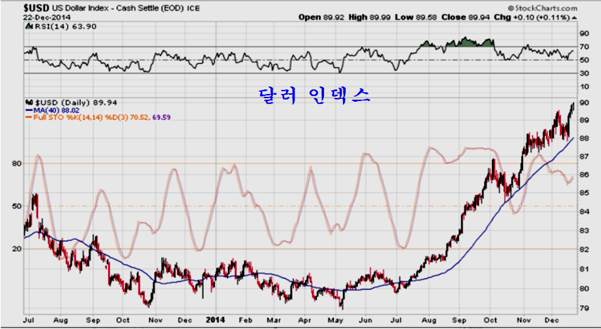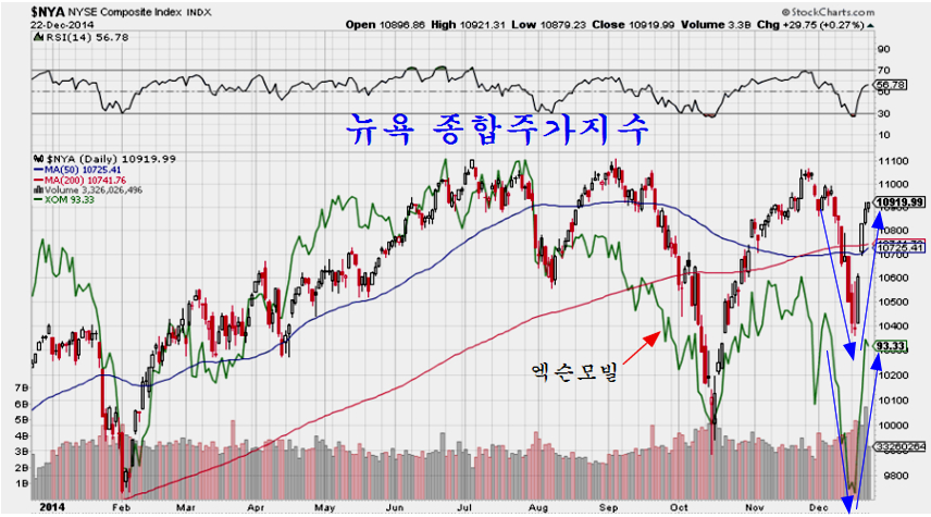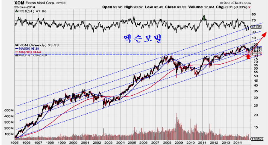 따라서 향후 중장기 흐름은 엑슨모빌의 주가 흐름이 중요하다. 엑슨모빌은 80$ 초반에 수년간의 매물대가 집중된 강한 지지권에 있고ㅡ 2013년말 고점을 돌파한 상승이 눌림목 지지권에 있는 만큼 장기적으로 강한 상승 추세의 시작이 기대되는 곳이다. 이런 점에서 뉴욕 증시를 비롯한 세계 증시는 하락보다 상승 추세가 진행될 가능성이 높다.