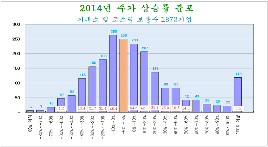 그러나 연말 시점에서 2013년말에 비교하여 거래소 코스닥 종목의 상승률을 분석해 보면, 힘든 투자자의 상황과는 달리 2014년에도 비교적 수확이 많은 한 해였다. 거래소와 코스닥 보통주 전체 1871종목 중 상승 종목은 전체의 54.6%이고, 하락 기업의 수는 45.5%로 상승 종목수가 많을 뿐 아니라 전체 상승률 평균도 지수와는 달리 14.6%의 상승률을 나타낸다.
