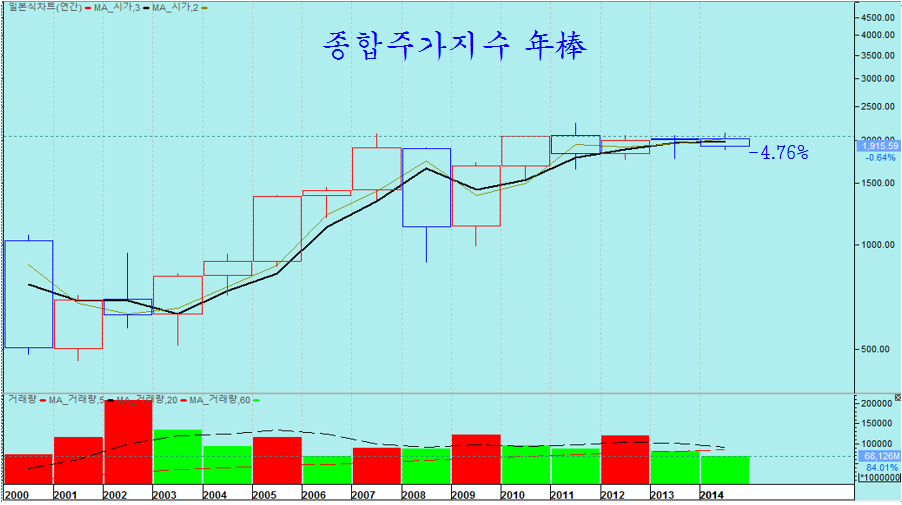 2013년말 2011에서 마감한 종합주가지수는 2013으로 출발하여 1881과 2093의 10% 변동폭을 오간 끝에 1915에서 마감함으로써 4.76% 하락으로 마감하였고 연봉도 음봉으로 마감하였다.