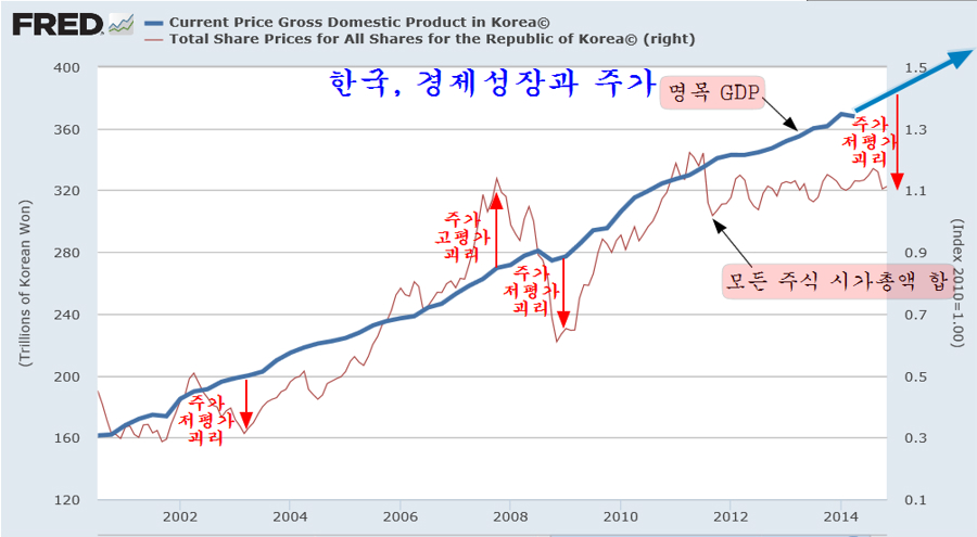 기업의 매출은 판매수량과 판매가격의 급으로 나타나는데, 판매 수량 증가는 경제 성장률, 판매 가격 상승은 물가상승률로 나타난다. 이런 점에서 기업의 매출과 이익이 누적되고 있음에도 주가지수는 제자리에 머물러 명목GDP 대비 주식 시가총액 괴리 상태는 2008년 금융위기 이후 가장 크며 2015년에는 1998년 외환위기에 해당하는 저평가 국면이 될 듯 하다.