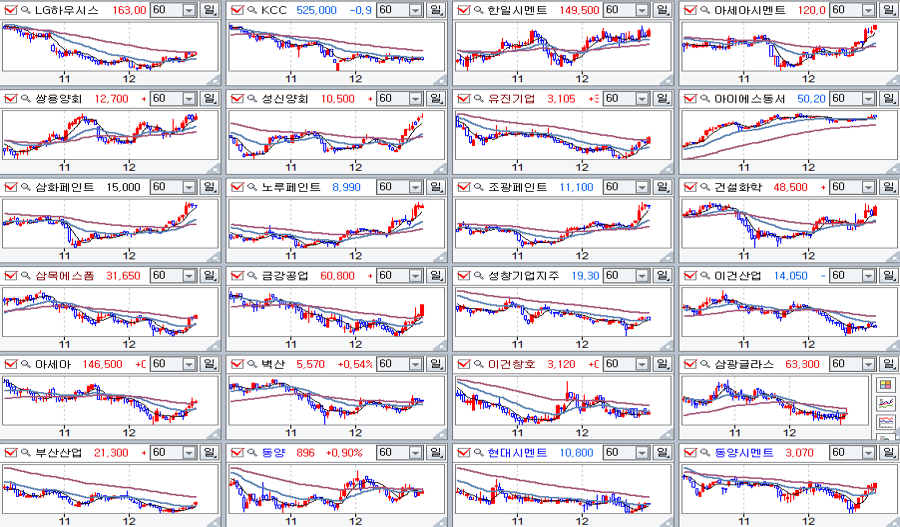 한편, 세계 산업재 경기 부진으로 인해 전반적으로 경기 민간주가 부진한 가운데서도, 2014년은 주택분양이 11년래 최대가 되면서 주택 건설 관련 자재 관련 기업들은 2012년 이후 시작된 대세 상승(연봉 기준 양봉 상승)이 3년째 계속 되고 있다.