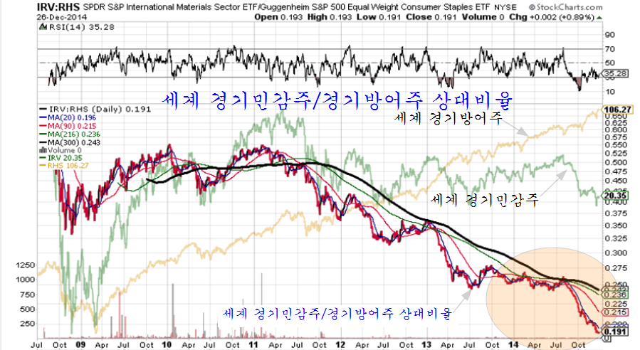 둘째, 경기 민감주가 부진했다. 쥬글라 경기 주기상 2014년은 성장이 시작되는 해였으나, 2013년 미국과 중국의 부동산 가격이 급등하면서 이 두 나라가 급격한 긴축정책으로 건설 경기를 억제한데다가 유럽의 회복이 늦어지면서 경기 민감주가 연중 내내 부진을 면치 못했다.