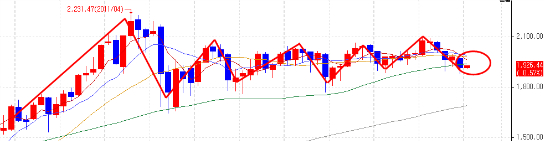 2014년 음봉 마감과 함께 강력한 양봉 시그널이 출현하지 않고 있으며