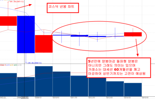 5년만에 양봉 시그널을 보이며 마감한 코스닥 년봉이다.코스닥 역시 6년 박스권이지만