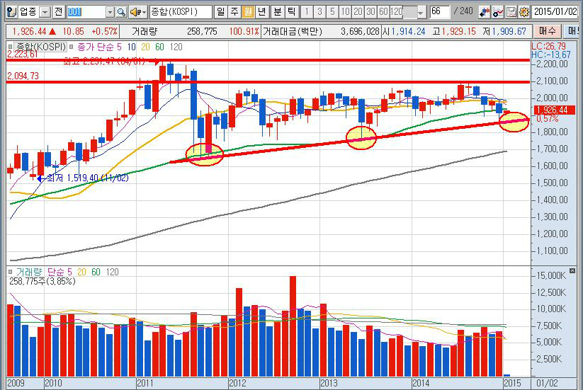 냉정히 2014년과 비교해 올해 월등히 좋은 강세장이 될 것이라 말할 수는 없다. 단 위 코스피 월봉차트에서도 확인했듯, 조금씩 지수의 저점은 높아지고 있다. 시장이 더 나빠지지 않는다는 것이다. 문제는 상단 저항대 돌파여부인데 2100pt를 돌파하더라도 2250pt이상을 바라보기는 쉽지 않은 상황이다.