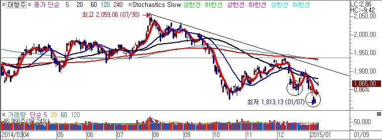 대형주 업종에 투자하려는 투자자는 이번 상승파동후 다음 상승파동에의 저점국면,즉 60일선 돌파후 재하락시