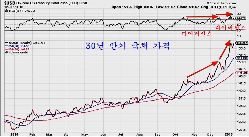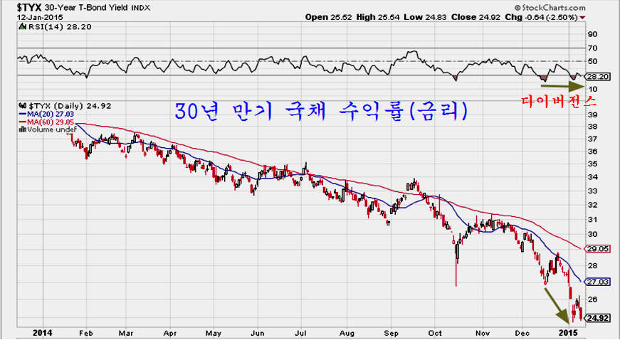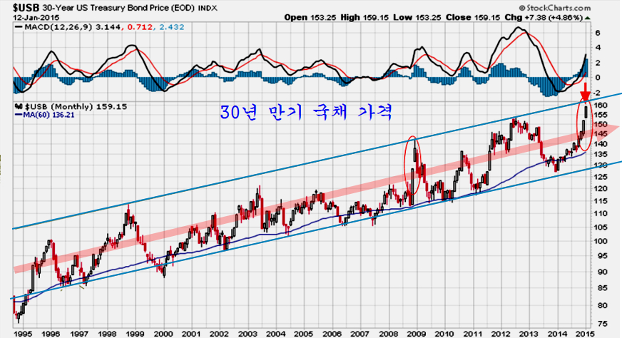 상품 지수가 아니라도 국채 금리와 국채 가격을 보면 시장은 중요한 대세 전환의 시점이 되어 있다. 2014년부터 저가권에 접한 채권가격이 오르면서 미국과 유럽 시장을 중심으로 주가가 조정을 거쳤으나, 7월 이후 금융시장의 이상 기류와 함께 채권 금리의 급락과 채권가격의 급등이 이어졌다.
