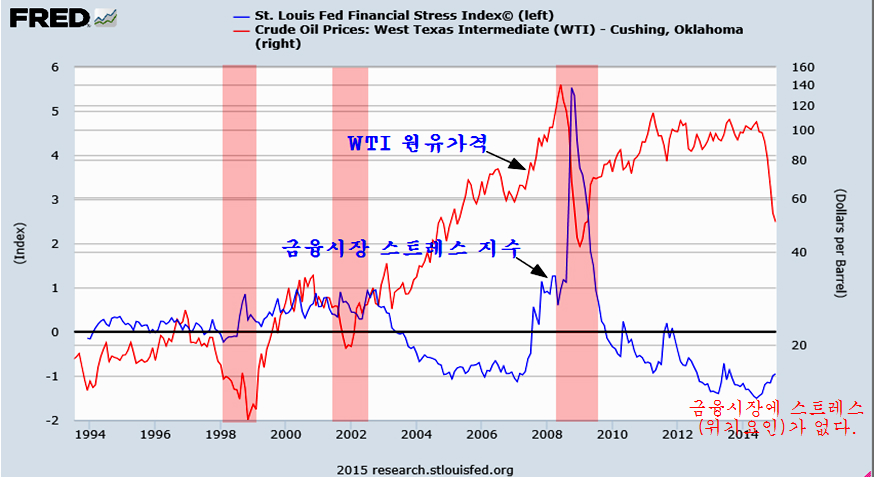 과거 유가는 세계적인 경기 둔화나 금융시장의 리스 확대 국면에서 하락하였지만, 2014년의 유가 하락은 유가를 급락으로 이끌만 한 요인이 크지 않다. 미국의 셰일 오일 생산이 늘었지만 지난해 9100만대가 증가한 자동차 증가에 따른 원유 수요 증가에 비하면 공급이 많지 않다. 원유 생산은 세계적으로 경제 성장률이 저성장 국면이기는 하지만, 센트루이스 금융시장 스트레스 지표로 볼 때 특별한 리스크가 없는 상태이다.