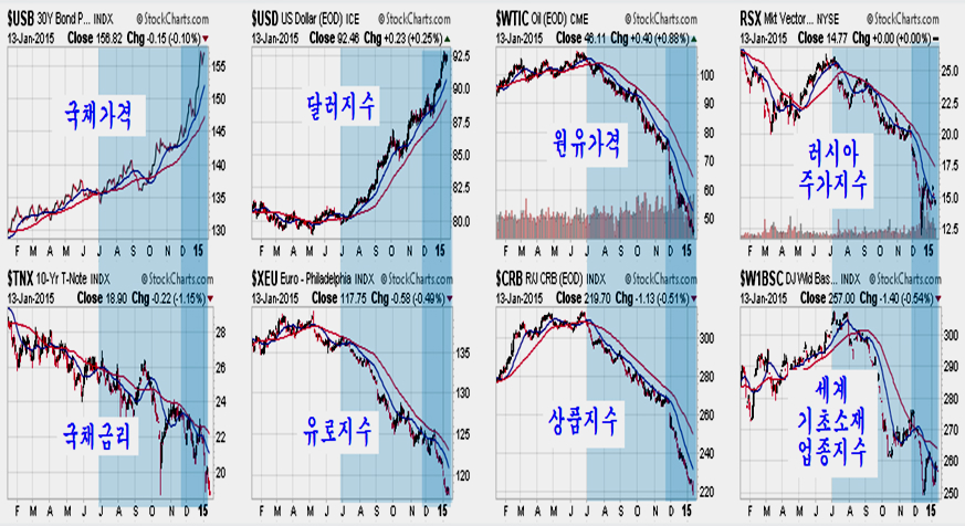 이런 상태에서 채권 금리가 급락하며, 채권가격이 오르고 달러가 강세이며, 상품가격과 함께 주가가 하락했다는 것은 매우 이례적인 일이다. 미국과 중국의 고정자산 투자 둔화와 함께 지난해 7월부터 시작된 금융시장의 기류는 11월 OPEC 회의를 기점으로 극단적인 투기 국면을 만들어 국채 가격 급등과 국채 금리 급락, 달러 급등과 유로 및 여타 통화 급락, 원유와 상품지수 급락, 산유국 주가를 비롯한 세계 기초소재 업종 ( 철강, 화학, 정유, 조선, 건설, 기계, 해운 등)의 동반 급락을 이끌었다.