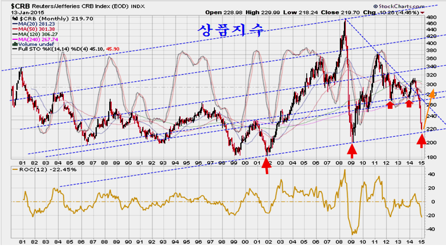 한편, 새해 들어서도 변동이 이어졌던 유가와 상품 지수는, 상품지수가 35년 대세 변동 채널의 가장 하단에 진입함에 따라 그간의 이상 급락을 마감하고 상승으로 움직일 시점이 된 것 같다.
