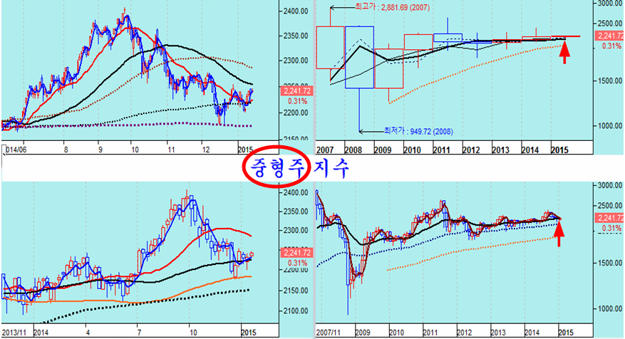따라서 기관과 외국인의 도박의 도구로 사용되는 종합주가지수로 시장을 판단하면 시장의 흐름을 놓치기 쉽다. 지수를 제외한 중형과 소형 코스닥의 흐름을 보면서 시장의 움직임을 파악한 후 그 흐름에 맞춰 관심 기업을 살펴야 한다.